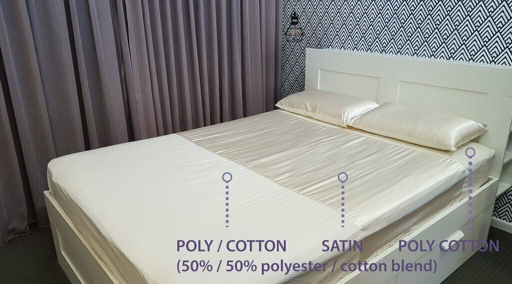 This unique design creatively combines 'Glossy Charmeuse' satin and a 50/50 blend cotton/polyester fabric which is beautiful to sleep on while being very durable.