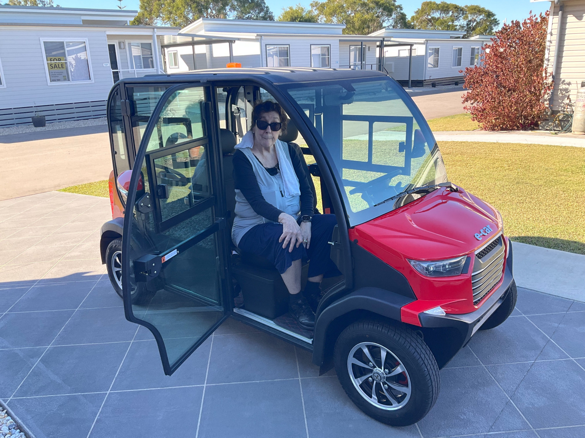 This is a 4 seat, 4 door enclosed weatherproof, heated, and air-conditioned unit that can carry Ann’s walker in the back seat area for use at our destinations within the Village.