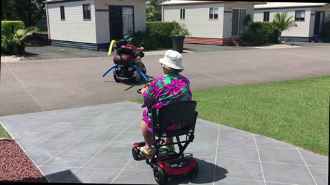 While the portable scooter is primairly an indoor unit, it can be pressed into service for short even ground outdoor use, as was the case here when Ann and friend were off to the Village pool.